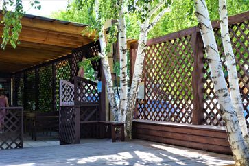 Мы предлагаем номера с мебелью и техникой, кухонными зонами и посудой, имеется общая терраса На территории базы отдыха есть и кафе, где можно вкусно покушать или сделать заказ комплексного питания для себя и семьи, кухня домашняя Так же гости могут пользоваться площадками для барбекю, а для деток имеется площадка для игр. Работает беспроводной интернет (WI-FI)