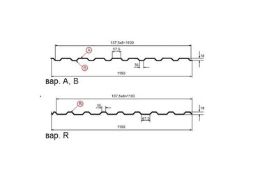 Профилированный лист МП-20х1100 представлен в двух вариантах, в зависимости от того, какая сторона профиля является лицевой. Это определяет и сферу применения материала: варианты А и B подходит для ограждений, R - для скатной кровли.