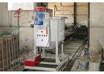 Линии работают по стационарной технологии и поставляются на базе самоходного смесителя-активатора объемом 0,7 м3. Смеситель-активатор перемещается по рельсовому пути, а формы для заливки размещаются справа и слева от него, форма рассчитана на 20 стандартных блоков. Распиловка массива выполняется ручными пилами с применением специального кондуктора. Распиловка возможна на блоки из газобетона размерами 203060 и 103060 (стеновой и перегородочный). Имеется возможность изготовить кондуктор под размеры пользователя.