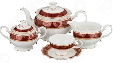 Чайный сервиз Lefard 586-324 станет отличным дополнением к набору посуды и прекрасно подойдет для сервировки праздничного чаепития. Он рассчитан на шесть персон и, помимо традиционных чашек с блюдцами, также включает в себя заварочный чайник, сахарницу и молочник. Посуда выполнена из фарфора, отличается изысканным дизайном и великолепным качеством исполнения. Все предметы выполнены в едином стиле и украшены изящным рисунком. Вместе они создают единый ансамбль и стилистически дополняют друг друга. Особенности и преимущества Изысканный дизайн. Волнистые края. Золотистая каемка. Оригинальный рисунок. Высококачественный фарфор. Lefard лучшее для вас Торговая марка Lefard уже на протяжении многих лет пользуется неизменной популярностью на рынке посуды. При создании своей продукции компания использует как традиционные, так и современные тенденции, что позволяет добиться высоких стандартов качества и удовлетворить пожелания любых, даже самых взыскательных, покупателей. None Возможен самовывоз. Есть доставка.