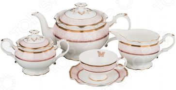 Чайный сервиз Lefard 586-330 станет отличным дополнением к набору посуды и прекрасно подойдет для сервировки праздничного чаепития. Он рассчитан на шесть персон и, помимо традиционных чашек с блюдцами, также включает в себя заварочный чайник, сахарницу и молочник. Посуда выполнена из фарфора, отличается изысканным дизайном и великолепным качеством исполнения. Все предметы выполнены в едином стиле и украшены изящным рисунком. Вместе они создают единый ансамбль и стилистически дополняют друг друга. Особенности и преимущества Изысканный дизайн. Волнистые края. Золотистая каемка. Оригинальный рисунок. Высококачественный фарфор. Lefard лучшее для вас Торговая марка Lefard уже на протяжении многих лет пользуется неизменной популярностью на рынке посуды. При создании своей продукции компания использует как традиционные, так и современные тенденции, что позволяет добиться высоких стандартов качества и удовлетворить пожелания любых, даже самых взыскательных, покупателей. None Возможен самовывоз. Есть доставка.
