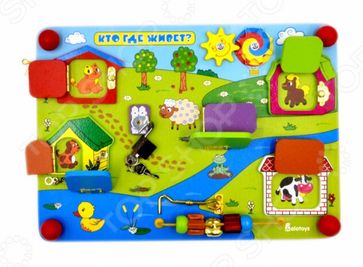 Бизиборд Alatoys Кто где живет доска с закрепленными на ней яркими деталями, которые заинтересуют ребенка. Открывающиеся дверцы и окна, подвижные крючки и замочки все это хочется тщательно изучить, пощупать и подвигать. В процессе игры развивается моторика пальчиков и цветовосприятие. На доске расположились и забавные персонажи, для которых ребенок сможет придумать интересную историю. Например, выйдут ли они на прогулку или чем хотят полакомиться. Сюжетная игра развивает воображение и фантазию, расширяет кругозор. Доска изготовлена из качественных и безвредных для ребенка материалов. Конструкция располагается на 4 устойчивых ножках. С помощью игрового набора можно изучать цвета, основы арифметики, названия животных, придумывать сказки и математические задачки. None Возможен самовывоз. Есть доставка.