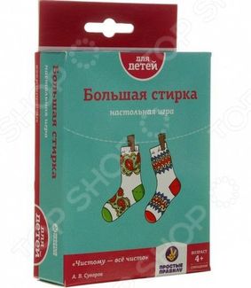 Игра настольная Простые правила Большая стирка рассчитана на 2-6 игроков от 4 лет. Цель игры первым среди игроков набрать заданное количество очков, следуя определенным правилам. Такая игра понравится не только детям, но и взрослым, и вы сможете играть в нее всей семьей. Вы сможете не просто интересно, но и с пользой провести свой досуг, ведь игра способствует развитию гибкости мышления, фантазии и любознательности у детей. Длительность одной партии примерно 15 минут. None Возможен самовывоз. Есть доставка.