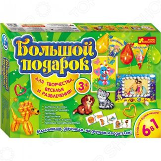 Набор для детского творчества Ранок Большой подарок это целых шесть оригинальных поделок в одном наборе! Он станет отличным подарком для вашего любимого чада и будет способствовать развитию у малыша мелкой моторики рук, фантазии и художественного вкуса. В набор входит: картина из песка создание аппликации из цветного песка; рамочка из ракушек декорирование рамочки для фотографий; гирлянда создание праздничной гирлянды; чудо-шарики создание игрушек из воздушных шариков; пазлы Часть и целое развивающая головоломка; гипсовые магниты-животные создание гипсовых игрушек на магнитах. None Возможен самовывоз. Есть доставка.