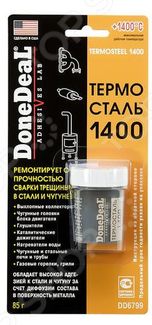 Герметик для ремонта стальных или чугунных изделий Done Deal DD 6799 Термосталь представляет собой средство, используемое для ремонта глушителей, газовых горелок, каталитических дожигателей, чугунных головок блока двигателя и т.д. Препарат устойчив к сильным вибрациям, большим ударным нагрузкам и к перепадам температуры. Для отвердевания герметик необходимо нагреть до рабочей температуры. Схватывается за 3-4 часа. None Возможен самовывоз. Есть доставка.
