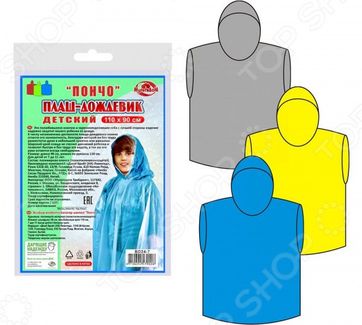 Товар продается в ассортименте. Цвет изделия при комплектации заказа зависит от наличия товарного ассортимента на складе. Плащ-дождевик детский Мультидом Пончо BD24-7 защитит ваше чадо во время непогоды. Дождевик свободно надевается поверх основной одежды и совершенно не стесняет движений, что очень важно для маленьких непосед. Он имеет гораздо больше преимуществ, чем другой защитный аксессуар зонтик. Выполнен из полиэтилена материал не пропускает влагу и отличается высокой прочностью, легко очищается от загрязнений и хорошо держит тепло. Полиэтилен не деформируется при складывании и не образует заломов. Свободный крой плаща не стеснит движений, позволит быстро и легко его надеть снять. Достаточно широкий вырез проймы и капюшон, который защитит голову и шею от капель. В сложенном виде модель очень компактна, она без труда разместится даже в небольшой сумке или рюкзаке. Оптимальная длина дождевика для комфортных игр и прогулки. С таким плащом можно отправляться даже на отдых за город или в поход. Модель рассчитана на детей от 7 до 11 лет длина 90 см, размах по рукавам 110 см . None Возможен самовывоз. Есть доставка.