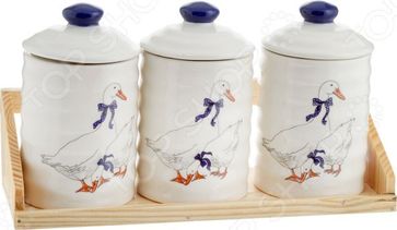 Набор банок для сыпучих продуктов Loraine Гуси 4705 отлично подойдет для хранения круп и быстрых завтраков, макарон, кофе, чая, разнообразных трав и специй, сахара и соли, а также меда, конфет и печенья. Емкости универсальны и очень удобны в использовании, они помогут поддерживать порядок на кухне и сделают готовку комфортной. Основной материал доломит; он не впитывает запахи и подходит для длительного хранения продуктов. Доломит легко очищается от загрязнений и не содержит вредных примесей. Укомплектованные крышки с силиконовыми прослойками обеспечат герметичность емкостей, защитят продукты от влаги, пыли, насекомых и обветривания. Банки декорированы забавным рисунком с гусями, они станут замечательным украшением кухонного интерьера. В комплекте 3 банки объемом 360 мл и деревянная подставка для удобного хранения емкостей и поддержания порядка. Размер подставки 26,5х9,2х7,5 см. Комплект подходит для мытья в посудомоечной машине. None Возможен самовывоз. Есть доставка.