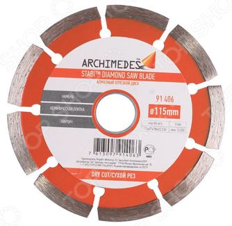 Диск отрезной Archimedes 91406 представляет собой комплектующую для угловых шлифовальных машин. Изделие отличается повышенной твердостью и используется для сухой резки камня, кирпича и керамической плитки. Основание диска выполнено из высокопрочной инструментальной стали 65 Mn. На режущую кромку нанесено связующее вещество и искусственные алмазы. Особенности и преимущества: Высокая прочность. Напыление из искусственных алмазов. Используется для сухого реза. Подходит для камня, кирпича и керамической плитки. None Возможен самовывоз. Есть доставка.