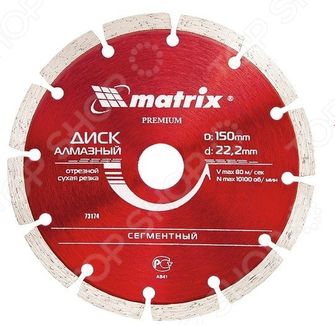Диск отрезной алмазный MATRIX Professional сегментный это долговечный отрезной диск для обработки изделий из твердых материалов. Диск делает точный и качественный пропил, он обеспечивает четкие кромки и чистое пиление. Режущий сегмент содержит большое количество синтетических алмазов, которые обеспечивают повышенную эффективность проводимых работ и вы заметите высокую износостойкость диска по сравнению с обычными вариантами. В случае, если вам необходимо провести качественную резку, этот диск именно то, что вам нужно, он предназначен для использования сухим методом резки. None Возможен самовывоз. Есть доставка.