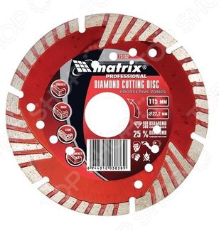 Диск отрезной алмазный MATRIX Professional сегментный с защитными секторами это долговечный отрезной диск для обработки изделий из твердых материалов. Диск делает точный и качественный пропил, он обеспечивает четкие кромки и чистое пиление. Режущий сегмент содержит большое количество синтетических алмазов, которые обеспечивают повышенную эффективность проводимых работ и вы заметите высокую износостойкость диска по сравнению с обычными вариантами. В случае, если вам необходимо провести качественную резку, этот диск именно то, что вам нужно, он предназначен для использования сухим методом резки. None Возможен самовывоз. Есть доставка.