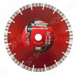 Диск отрезной алмазный MATRIX Professional турбо-сегментный это долговечный отрезной диск для обработки изделий из твердых материалов. Диск делает точный и качественный пропил, он обеспечивает четкие кромки и чистое пиление. Режущий сегмент содержит большое количество синтетических алмазов, которые обеспечивают повышенную эффективность проводимых работ и вы заметите высокую износостойкость диска по сравнению с обычными вариантами. В случае, если вам необходимо провести качественную резку, этот диск именно то, что вам нужно, он предназначен для использования сухим методом резки. None Возможен самовывоз. Есть доставка.