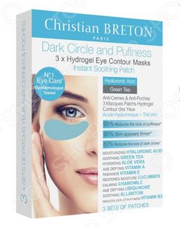 Набор патчей от темных кругов и отечности вокруг глаз Christian Breton Paris Dark Circle and Pufiness эффективная и качественная маска для интенсивного ухода за кожей вокруг глаз. Маска выполнена в виде парных полумесяцев из гидрогеля, благодаря чему полностью обхватывает область под глазами. Патчи пропитаны активными ингредиентами и гиалуроновой кислотой, поэтому снимают усталость, уменьшают темные круги и отеки под глазами. Средство дарит коже чувство невероятной легкости и комфорта. После регулярного применения кожа под глазами становится более ровной, улучшается ее состояние, уходит выраженность мимических морщин. Какие активные компоненты входят в состав маски Коэнзим Q10 или убихинон выступает в качестве антиоксиданта, нейтрализующего воздействия свободные радикалов. Замедляет возрастные изменения и образование новых морщин, уменьшает глубину и выраженность сетки мимических морщин. Придает коже свежесть и подтянутость. Гиалуроновая кислота нормализует водный баланс и создает благоприятную среду для активизации синтеза коллагеновых и эластиновых волокон. Кожа становится более эластичной и упругой, замедляются процессы старения. Аллантоин или экстракт корня окопника обладает мощным заживляющим воздействием, успокаивает раздраженную кожу и стимулирует ее обновление на клеточном уровне. Экстракт алоэ накапливает и удерживает в коже влагу, также является мощным источником антиоксидантов и нейтрализует действие свободных радикалов. Участвует в активации синтеза коллагена, повышает упругость кожи. Витамин А эффективно борется с возрастными морщинами и гиперпигментацией, обновляет клеточные структуры кожи, препятствует увеличению лишнего пигмента. Витамин Е выступает в качестве природного источника молодости и естественного антиоксиданта. Регенерирует кожу, создает защитный барьер и повышает показатели влаги. Зеленый чай нормализует обменные процессы в клетках кожи, усиливает кровообращение и лимфоток, а также снимает отечность в области глаз. Витамин В3 усил
