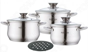 Набор кастрюль Bohmann 0114BH прекрасно дополнит интерьер вашей кухни. Набор изготовлен из качественного материала и состоит из 3 кастрюль разного объема с крышками и специальной подставки. В наборе всего представлено 7 предметов. Набор кухонной посуды изготовлен из высококачественной нержавеющей стали с капсульным дном. Изделия снабжены крышками из термостойкого стекла с паровыпуском , а также удобными стальными ручками. Подходит для всех видов плит, включая индукционную. Мерная шкала, которая быстро поможет хозяйке определить объем содержимого кастрюли. Еще одно преимущество набора бакелитовая подставка. Благодаря этому дополнению вы сможете ставить горячую кастрюлю на любой стол, не опасаясь того, что его поверхность может испортиться. Особенности модели Стеклянные крышки с пароотводом. Наличие мерной шкалы. Состав: кастрюля с крышкой 16 х 11.5 см 2.9 л; 20 х 12.5 см 3.9 л; 22 х 13.5 см 5,0 л; Жаропрочная подставка. None Возможен самовывоз. Есть доставка.