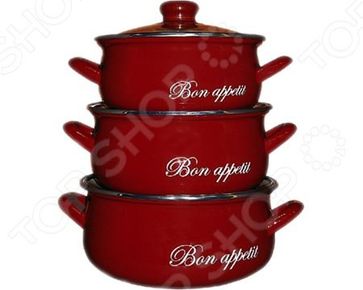Набор кастрюль Interos 2234 Bon appetit станет отличным дополнением к набору вашей кухонной утвари. В комплекте три кастрюли различного объема с крышками: 2.1, 3.1 и 4 литра. Посуда функциональна и универсальна в использовании, подойдет для варки супов, гарниров, макарон, овощей, компотов и т.д. Кастрюли выполнены из высококачественных ударопрочных материалов и снабжены двухслойным эмалевым покрытием, не вступающим в реакции с продуктами и не искажающим вкус приготовленных блюд. Крышки изготовлены из закаленного жаростойкого стекла, снабжены металлическим ободком для защиты от сколов и пароотводом. Кастрюли подходят для всех типов плит. None Возможен самовывоз. Есть доставка.