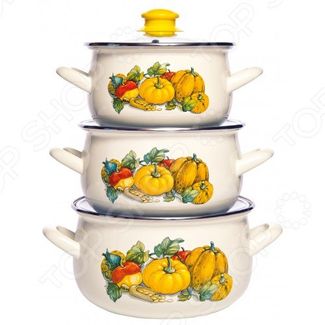 Набор кастрюль Interos Тыква станет отличным дополнением к набору кухонной утвари. С его приобретением приготовление ваших любимых блюд перейдет на качественно новый уровень и вы сможете воплотить в жизнь любые кулинарные идеи. Кастрюли практичны и функциональны в использовании, подходят для варки супов, бульонов, гарниров, овощей и др. Особенности и преимущества Крышки из жаропрочного стекла. Отверстия для выхода пара. Эргономичные металлические ручки. Прочное эмалевое покрытие. Яркий красочный рисунок. В качестве материала изготовления используется высококачественная сталь. Этот металл повсеместно применяется в производстве кухонной посуды, благодаря долговечности и устойчивости к образованию царапин и трещин. Сталь, даже под воздействием высоких температур, не вступает в реакции с, содержащимися в продуктах, кислотами и щелочами, что способствует максимальному сохранению полезных веществ и микроэлементов. None Возможен самовывоз. Есть доставка.