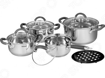 Умение хорошо и вкусно готовить причина гордости любой хозяйки. И несмотря на то, что львиная доля этого умения зависит от таланта, внимательности и скрупулезности, ни для кого не секрет, что вкус и аромат любого блюда зависит от того, в какой посуде оно было приготовлено. Дешевые кастрюли или сковородки сомнительного качества способны испортить не только вкус продуктов металлическим послевкусием, но и варочную поверхность, если вдруг лопнут или протекут. Качественная посуда для вашей кухни! Набор посуды для готовки Vitesse VS-2065 это идеальный выбор для умелых хозяек, которые ценят качество, практичность и простоту. Он предназначен для экологичного и здорового приготовления пищи. Благодаря тому, что при производстве используется высококачественная нержавеющая сталь, прошедшая все необходимые проверки качества, вкус и качество продуктов не меняется даже после длительного процесса приготовления. Многослойное термоаккумулирующее дно обеспечивает равномерное распределение тепла и быстрый нагрев, поэтому готовить можно начинать через несколько минут после того, как кастрюля была поставлена на огонь . Оцените главные преимущества этого набора Разный объем кастрюль для комфортного приготовления самых разнообразных блюд. Прочные и удобные ручки надежно закреплены. Крышки из термостойкого стекла имеют металлический обод, который надежно защищает от возникновения сколов и трещин по краям. Изделия просты в уходе и подходят для мытья в посудомоечной машине. Внутренняя шкала литража. Комплект состоит из 9 предметов: 3 кастрюль разного объема с крышками, ковша на 1,8 л, также с крышкой. Это означает, что вы сможете выбрать посуду нужного вам типа и объема, а не оставлять её полупустой в холодильнике. Объем большой кастрюли составляет 5,9 л, а маленькой 2,4 л. В комплекте также предусмотрена черная бакелитовая подставка. Продуманная конструкция, стильное исполнение! Главная особенность данного набора посуды заключается в его простом, но современном дизайне. Тщательная поли