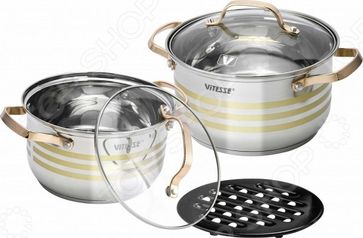 Набор кастрюль Vitesse VS-2080 будет отличным дополнением к комплекту вашей кухонной утвари. Приготовление любимых блюд с его приобретением перейдет на качественно новый уровень и вы сможете воплотить в жизнь любые кулинарные идеи. В комплект входят две кастрюли с крышками и круглая подставка под горячее. Набор многофункционален и удобен в использовании, подойдет для варки супов, приготовления блюд из мяса и рыбы, гарниров, соусов т.д. Особенности и преимущества Стильные золотистые ручки из гальванизированной стали. Крышки из термостойкого стекла с металлическими ободками для защиты от сколов и трещин. Капсулированное дно имеет прослойку из алюминия и обеспечивает равномерное распределение тепла. Шкала литража нанесена на внутреннюю стенку кастрюль, позволяет точно отмерить объем набранной жидкости. Многофункциональность посуда совместима с газовыми, электрическими, стеклокерамическими, чугунными, галогеновыми и индукционными конфорками. В качестве материала изготовления используется высококачественная нержавеющая сталь. Этот металл повсеместно применяется в производстве кухонной посуды, благодаря долговечности и устойчивости к образованию царапин и трещин. Сталь, даже под воздействием высоких температур, не вступает в реакции с, содержащимися в продуктах, кислотами и щелочами, что способствует максимальному сохранению полезных веществ и микроэлементов. None Возможен самовывоз. Есть доставка.