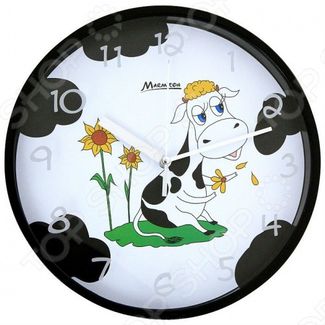 Часы настенные Marmiton Му-Му оформлены изображением забавной коровы, помещенной в круглую черную оправу изготовленной из пластика. Циферблат часов защищен прозрачным пластиком. Есть три стрелки. Подойдут в качестве подарка всем ценителям ярких и необычных вещей. None Возможен самовывоз. Есть доставка.
