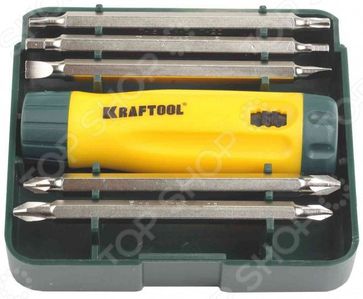 Отвертка реверсивная с битами Kraftool 26141-H6 предназначена для монтажных, крепежных или ремонтных работ с резьбовыми соединениями, имеющими самые разнообразные рабочие профили. Оптимальная комплектация, проверенное временем качество инструмента удовлетворит потребности не только любителя, но и профессионала. Удлиненные двусторонние биты для инструмента изготовлены из хромо-ванадиевой стали. Они покрыты специальным износостойким и антикоррозийным слоем, поэтому прослужат долго. Оснащенная реверсом эргономичная двухкомпонентная рукоять, обеспечит надежный и удобный захват в процессе работы. Набор поставляется в пластиковом кейсе для комфортного хранения или транспортировки. None Возможен самовывоз. Есть доставка.