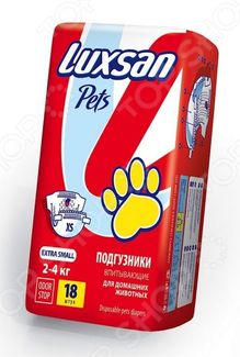 Подгузники впитывающие для домашних животных Luxsan Pets - обеспечат надежную защиту, гигиену и комфорт. Поверхность подгузника приятная на ощупь, а впитывающий слой не сбивается и не образует комков. Система Odor Stop предотвращает появление запаха. Подгузник легко одевается, не стесняет движений питомца. Застегивается на многоразовые застежки-липучки. None Возможен самовывоз. Есть доставка.