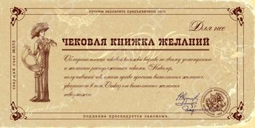 Чековая книжка желаний 1 2 team Для Нее это прекрасный сувенир, который способен подарить массу возможностей. Дама преподносит чек кавалеру, а он имеет право на выполнение желания, указанного в нем. Пригласить на свидание, приготовить ужин, поцеловать или сделать массаж все зависит только от вашего желания. Такая чековая книжка наверняка придется по вкусу любому мужчине, доставляя ему радость, и привнося в отношения задора и романтичности. None Возможен самовывоз. Есть доставка.