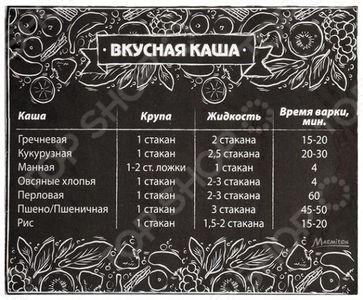 Магнитики представить без них современную кухню сегодня практически невозможно. Более того, двери некоторых холодильников просто напрочь заставлены этими милыми красочными фигурками. Магниты-фотографии, забавные смайлики или магниты, привезенные из путешествий у каждого из них своя история и свое назначение. А задумывались ли вы, что помимо украшения кухни и напоминания об отпуске у моря, магнитики можно использовать еще и как очень удобные и нужные кулинарные шпаргалки Кулинарная шпаргалка Представляем вам магнит-шпаргалку Marmiton Вкусная каша 16170! Разваренный рис, недоваренная гречка или манная каша с комочками с такой шпаргалкой вы навсегда забудете об этих мелких недоразумениях. Больше не возникнет вопроса сколько времени варить кашу и в какой пропорции залить крупу водой. Забыли Просто взгляните на магнитик! Особенности и преимущества Оптимальный размер. Магнитное основание вы с легкостью сможете зацепить шпаргалку на дверцу холодильника или любую другую металлическую поверхность. Подробные инструкции по приготовлению гречневой, кукурузной, манной, овсяной, перловой, пшеничной и рисовой каши. None Возможен самовывоз. Есть доставка.