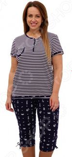 Костюм Алтекс Капитанша поможет вам создавать невероятные образы, всегда оставаясь женственной и утонченной. Грамотный крой и цвет скрывают недостатки фигуры и подчеркивают достоинства. Вещь, состоящая из футболки и бриджей, хорошо подойдет для отдыха дома или на даче, прогулок по городу. Футболка полуприлегающего силуэта с классическим узором в полосочку. Круглый вырез горловины дополнен застежкой на пуговицы. Накладной карман. Длина на уровне бедер. Бриджи с удобным поясом на резинке. По бокам внизу штанин завязки. Изделие произведено в России. Костюм сшит из приятной ткани, состоящей на 100 из хлопка. Материал не линяет, не скатывается, формы от стирки не теряет. None Возможен самовывоз. Есть доставка.