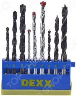 Набор DEXX 2970-H9 z01 состоит из 9 предметов, среди которых имеются сверла по металлу, дереву и кирпичу. Благодаря данному комплекту, вы сможете легко и быстро просверлить отверстия необходимого диаметра как в металлических деталях и заготовках, так и в разнообразных деревянных и кирпичных конструкциях при помощи электродрели. Оптимальная комплектация и проверенное временем качество инструмента удовлетворят потребности даже профессионала. В комплекте сверла размерами: по металлу, 3 шт.: 4, 6, 8 мм; по дереву, 3 шт.: 4, 6, 8 мм; по кирпичу, 3 шт.: 4, 6, 8 мм. None Возможен самовывоз. Есть доставка.
