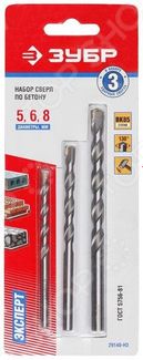 Набор сверл ударных по бетону и камню Зубр Эксперт 29140-H3 станет отличным дополнением к набору рабочих инструментов. Сверла предназначены для ударно-вращательного просверливания отверстий в твердом материале, например в бетоне, кирпиче или камне. Инструменты выполнена из высокопрочных материалов на высокоточном оборудовании, прошли жесткий контроль качества, что делает их максимально надежными и прочными. Набор сверл разного диаметра поставляется в блистерной упаковке. Размер: 5, 6, 8 мм. None Возможен самовывоз. Есть доставка.