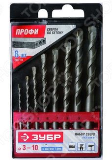 Набор сверл по бетону ударные Зубр Профи 2922-H8 состоит из 8 сверл с с усиленными пластинами из твердого сплава марки ВК8. Предназначен для сверления бетона, кирпича, изделий из природного или искусственного камня ударной дрелью или перфоратором. Усиленный стальной стержень защищает сверло от деформации при ударных нагрузках. П-образная спираль значительно ускоряет отвод продуктов сверления и снижает нагрев инструмента. В набор входят сверла наиболее популярных размеров: 3 мм, 4 мм, 5 мм, 6 мм, 7 мм, 8 мм, 9 мм, 10 мм. Сверла хранятся в прозрачной пластиковой кассете, где имеются пазухи для каждого отдельного сверла. None Возможен самовывоз. Есть доставка.