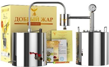Самогонный аппарат с сухопарником Добрый Жар Дачный , используемый для получения самогона в домашних условиях. Принцип работы прибора основан на методе дистилляции, а именно на испарении спирта с его последующей конденсацией. Зачастую, самогонные аппараты-дистилляторы применяют для перегонки браги в спирт-сырец для последующей ректификации, либо, когда нужно максимально передать вкус исходного сырья. Дистиллятор выполнен из высококачественной, не вступающей в реакции окисления, нержавеющей стали. Наличие сухопарника позволяет лучше очистить исходный продукт от сивушных масел и, как результат, получить более чистый самогон. Для охлаждения змеевика аппарат имеет дополнительный резервуар для воды. Достаточно залить в него холодную воду, и можно заниматься перегонкой практически в любых условиях, хоть на костре. None Возможен самовывоз. Есть доставка.