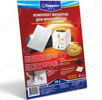 Набор фильтров для фритюрницы Topperr FF 1 идеально подойдет для любой модели фритюрницы со сменными фильтрами. Фильтры обеспечивают чистоту и нейтрализуют запахи на кухне во время готовки. В комплект входят два вида фильтровального полотна: угольное и аэрозольное. Угольный фильтр отвечает за поглощение запахов при приготовлении пищи, тогда как аэрозольный препятствует образованию масляных испарений. Для продления срока службы вашей фритюрницы и сохранения чистоты в помещении, требуется регулярно заменять фильтры на новые, согласно инструкции по эксплуатации вашей техники. В комплекте находятся два больших фильтровальных полотна, которые следует индивидуально разрезать на куски необходимого размера, подходящие именно вашей модели фритюрницы. Поэтому, согласно инструкции, наложите использованный фильтр на универсальное полотно того же типа очистки и аккуратно вырежьте новый фильтр с помощью ножниц. Из одного универсального полотна можно вырезать от четырех и более фильтров, в зависимости от модели бытовой техники. None Возможен самовывоз. Есть доставка.