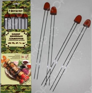 Набор двойных шампуров BOYSCOUT с деревянными ручками пригодится любителям пикников с шашлыками. Двойной шампур упрощает запекание крупных кусков мяса и целых овощей. Деревянные ручки обеспечивают удобство переворачивания шашлыка на шампуре. На таких шампурах шашлыки можно сразу подавать на стол. Длина шампуров 34 см. В упаковке 4 шт. None Возможен самовывоз. Есть доставка.