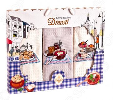 Кухня или столовая место, где всегда тепло и уютно, вкусно и аппетитно пахнет. Уют в этих комнатах зависит не только от правильно подобранного интерьера, мебели или элементов декора. Именно полотенца, скатерти, салфетки и другой интерьерный текстиль создают удивительную атмосферу комфорта. Уютная кухня уютный дом Комплект из 3-х кухонных полотенец Dinosti Континентальный завтрак набор незаменимым атрибутов любой хозяйки, без которого невозможно представить ни одну современную кухню. Вафельные полотенца созданы не только для украшения вашей кухни, они имеют и строго функциональное предназначение. Выполненные из натуральной хлопковой ткани, изделия прекрасно впитывают влагу, поэтому идеально подходят для вытирания посуды или рук. Главные достоинства хлопковых полотенец Тонкое и прочное хлопчатобумажное плотно из 100 хлопка обладает рядом преимуществ: абсолютно натуральное и безопасное; не доставляет дискомфорт нежной коже рук; великолепно впитывает лишнюю влагу; не царапает деликатную поверхность посуды или столовых приборов. Хлопковое вафельное полотно также отличается удивительной прочностью, легкостью и простотой в уходе. Даже после многочисленных стирок полотенца не потеряют форму и свои великолепные качества. Интересный сюжет вышивки поднимет настроение и создаст приятную атмосферу на кухне! В комплекте 3 полотенца размером 60х47 см. None Возможен самовывоз. Есть доставка.