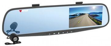 Видеорегистратор Artway AV-600 записывающее устройство для автомобилей, имеет надежное крепление для удобной установки в автомобиле. Устройство выглядит как зеркало заднего вида, что позволяет сделать его незаметным в салоне автомобиля, а также реализовать дополнительные функции, объединяющее в себе видеорегистратор с двумя камерами, помощник для парковки и усовершенствованное зеркало заднего Особенности Фронтальная камера оснащена микрофоном и осуществляет видеосъемку в формате FULL HD. Задняя снимает видео и помогает при парковке. После переключения задней скорости на изображение с выносной камеры накладываются линии, обозначающие близость к преградам и опасностям позади автомобиля. В остальных случаях видеорегистратор фиксирует все происходящее с двух камер и сохраняет видео в различные файлы. Функция циклической записи, когда старые записи постепенно заменяются новыми, и датчик движения, активирующий старт видеозаписи при появлении движущихся объектов в кадре, позволяют сбалансировать заполнение карты памяти. Из-за своей неприметного вида в салоне, его можно оставить в автомобиле даже на период длительной парковки. Реализованная функция мониторинга парковки в случае нештатных ситуаций на стоянке активирует видеозапись происходящего и помогает в дальнейшем определить виновника произошедшего. Важные видеозаписи ДТП или яркие события из путешествий не можно сохранить с помощью функции SOS, нажатием кнопок на корпусе устройства. Дополнительно встроенный G-сенсор датчик удара защитит от удаления видеозаписи в случае столкновения или резкого торможения автомобиля. Сохраненные видео и фотографии можно посмотреть на экране с диагональю 4,3 дюйма. Во время работы видеорегистратора на него передаются изображения с двух камер. Водитель может отключить подсветку экрана, чтобы использовать зеркало заднего вида привычным образом. Сохраненные видео могут быть перенесены на компьютер через USB-порт или на телевизор через AV-выход. Видеорегистратор ARTWAY AV-600 поддержи
