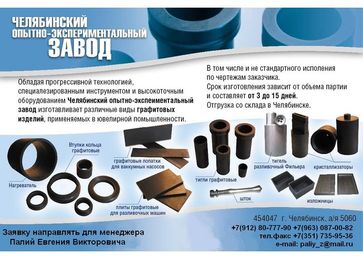 «Челябинский опытно-экспериментальный завод» - изготавливает изделия из графитов более 30 марок, любой сложности, в том числе и по чертежам заказчика. Марки графита (ГЭ, ЭГП, МГ, ГМЗ, 3ОПГ, МПГ-6, МПГ-7, АРВ,АГ-1500, АГ-1500Б83, АГ-1500СО5, СГ-Т, И1, И3 и т.д.)