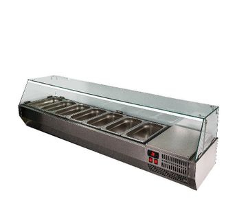 Настольные охлаждаемые витрины (ВИТРИНЫ ДЛЯ ИНГРЕДИЕНТОВ) могут использоваться как вместе со столом для пиццы, так и как отдельные единицы холодильного оборудования.Предназначены для установки как с фиксацией на бортах гранитной столешницы столов для пиццы, так и на любых ровных поверхностях (благодаря наличию регулируемых по высоте стопок). В том числе - на столешницах холодильных и нейтральных столов, элементах линий раздачи, барных стойках, прилавках и т.п.Витрина VT2v-G со стеклянным защитным колпаком рассчитана на гастроемкости GN 1/3 (5 шт.). При этом гастроемкости в комплект поставки не входят. None Есть доставка.