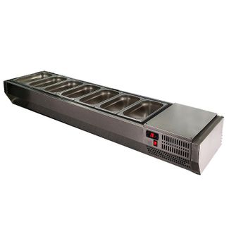 Настольные охлаждаемые витрины (ВИТРИНЫ ДЛЯ ИНГРЕДИЕНТОВ) могут использоваться как вместе со столом для пиццы, так и как отдельные единицы холодильного оборудования.Предназначены для установки как с фиксацией на бортах гранитной столешницы столов для пиццы, так и на любых ровных поверхностях (благодаря наличию регулируемых по высоте стопок). В том числе - на столешницах холодильных и нейтральных столов, элементах линий раздачи, барных стойках, прилавках и т.п.Витрина VT3v-G со стеклянным защитным колпаком рассчитана на гастроемкости GN 1/3 (7 шт.). При этом гастроемкости в комплект поставки не входят. None Есть доставка.