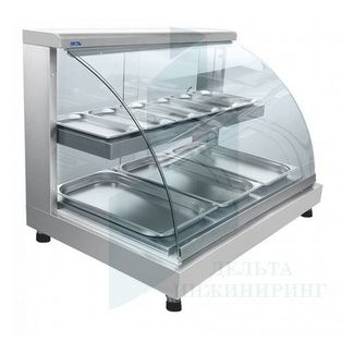 Витрина тепловая настольная типа ВТН 70 предназначена для демонстрации и поддержания в горячем состоянии (при заданной температуре) пищевых продуктов на тарелках или в функциональных емкостях и реализации их потребителю. Основные характеристики настольной тепловой витрины ВТН-70:- устанавливается на любую плоскую ровную поверхность подходящего размера благодаря регулируемым по высоте ножкам;- терморегулятор для задания и поддержания температуры в ванне;- терморегулятор для задания и поддержания температуры в витрине;- 5 ТЭН-ов: 2 - в полке, 3 - в ванне;- диапазон регулирования температуры в витрине от +20 до +85 С;- работа при температуре окружающей среды от +12 до +42 С;- две раздвижные стеклянные дверцы со стороны персонала;- 5 люминисцентных ламп освещения: 2 - под полкой, 3 - под верхней крышкой;- полка, стойки и основание витрины выполнены из нержавеющей стали AISI 304 толщиной 1 мм;- размеры полки 1043х372х60 мм;- сквозная перфорация полки обеспечивает равномерное распределение тепла в витрине; - боковые стенки и раздвижные дверцы из закаленного стекла толщиной 5 мм;- гнутое закаленное стекло толщиной 6 мм со стороны покупателя;- в комплекте гастроемкости GN 1/1-40 3 шт. и GN 1/3-20 - 5 шт.Номинальная потребляемая мощность, Вт: 2270 Номинальное напряжение, В: 230 Количество ТЭН-ов, шт.: 5 Диапазон регулирования температуры в витрине, °С: +20...+80 Рабочая температура на полке, °С, при установке терморегулятора на 60 °С: 60±10 Время разогрева теплового прилавка до рабочей температуры, мин: 20 Полезный объем витрины, м3 : 0,27 Демонстрационная площадь витрины, м3: 0,93 Габаритные размеры, мм : 1120х730х860 Масса, кг: 85 None Страна производства: Россия Есть доставка.