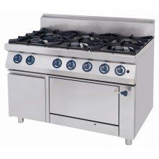 Профессиональная комбинированная плита 700-й серии, производства KOGAST (Словения) модель KS-Т67/1K-0, является одним из важнейших устройств оснащения горячих цехов для приготовления различных блюд в наплитной посуде. Данная модель является хорошим выбором для широкого круга предприятий общественного питания, таких как заведения фаст-фуда, большинство ресторанов и кафе.Комбинированная плита KS-Т67/1K-0 имеет 6 круглых газовых горелок. Три газовые горелки имеют мощность 3,5 кВт, две горелки - 5,5 кВт и одна 7 кВт.Электрический духовой шкаф имеет следующие внутренние размеры (мм): 540 (ширина), 480 (глубина), 300 (высота). Духовой шкаф имеет мощность 6,7 кВт. Горелки и стабилизатор пламени спрятаны под опорной плитой. Печь имеет направляющие для гастроемкостей формата GN 1/2. Дверца двухслойная утопленная для обеспечения хорошей теплоизоляции. Внутренняя камера, направляющие, внутренняя панель дверцы и ручка выполнены из нержавеющей стали AISI 304.Электромеханическая панель управления размещена в верхней части плиты под конфорками на передней панели. Данное расположение является более удобным для работы поваров: управление - "под рукой". Для плавного переключения тепловой мощности конфорки используются регуляторы степени нагрева – раздельно для каждой конфорки. Благодаря большому числу позиций нагрева удается более точно подобрать режим приготовления для каждого блюда. Для исключения перегрева конфорок установлены блокирующие термостаты.KOGAST KS-Т67/1K-0 является напольной моделью и имеет следующие габаритные размеры (мм): 1200 (ширина), 700 (глубина), 900 (высота) и весит 147 кг. Корпус выполнен из нержавеющей стали AISI 304. В качестве системы опор выступают 4 регулируемые ножки из нержавеющей стали. Устройство работает от сети с напряжением 400 В и частотой 50 Гц. Газовая мощность данной модели составляет 28,5 кВт, а электрическая – 10,7 кВт. Данная модель также оснащена нейтральным шкафом, который можно использовать для различных производственных нужд.П