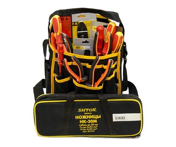 Пассатижи 180 мм; Кусачки боковые 160 мм; Тонкогубцы 160 мм; Тонкогубцы изогнутые 160 мм; Отвертка индикаторная; Отвертка 1000В Sl4.0x100 мм; Отвертка 1000В Sl5.5x125 мм; Отвертка 1000В Sl6.5x150 мм; Отвертка 1000В Ph0x75 мм; Отвертка 1000В Ph1x100 мм; Отвертка 1000В Ph2x125 мм; Ножницы секторные НС-32; Съемник изоляции СИ-6Н; Нож для снятия изоляции с круглого кабеля диам. от 8 до 28 мм с доп. прямым лезвием; Клещи электромонтажные многофункциональные "5в1" КЭ-6М; Кабелерез 160 мм; Ручной зажим струбцина 180 мм; Переставные клещи 250 мм; Сумка монтажника;