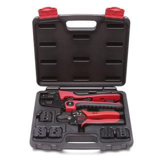 Состав набора:пресс-клещи с механизмом быстрой смены матрицкомплект из 5 сменных матрицкабельные ножницы-стриппер МС-05прочный пластиковый кейсФиксация и высвобождение матриц нажатием на рычагиУ совершенствованный рычажный механизм. Усилие при опрессовке на 30% меньше, чем при использовании аналогичного инструментаХраповой механизм, обеспечивающий блокировку обратного хода до завершения полного цикла опрессовкиЭргономичные двухкомпонентные рукоятки с мягкими нескользящими вставками из TPR-резиныРегулятор прижимного усилия матрицМеханизм разблокировки рукоятокВес набора/инструмента: 1.25/0.45 кгДлина: 215 ммГабариты кейса: 244x223x55 мм