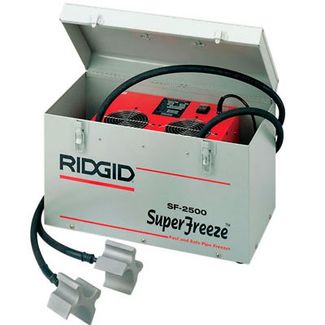 С помощью аппарата Ridgid SF-2500 можно быстро и качественно произвести заморозку стальных и медных труб. Устройство может применяться при техническом обслуживании и ремонте трубопроводов. Оно позволяет не сливать воду из труб при работе. Данный аппарат можно с легкостью переносить благодаря его автономности. Также он оснащен компрессором с мощностью 0,45 кВт. Шланги изготовлены из резины и имеют специальную защитную оплетку, благодаря которой являются очень износоустойчивыми. Толщина шланга составляет 2,5 мм, а длина будет составлять 2,5 м. Данный аппарат отлично справится с трубами, которые высоко расположены. Для оптимального охлаждения используются два вентилятора.