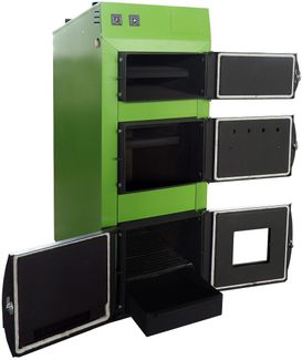 Котлы DRAGON-Bio — это универсальный котел, модельный ряд от 12 кВт до 60 кВт. Высокий КПД котла (до 88% на дровах, до 92% на угле, до 94% на пеллетах). Котел изготовлен из листовой стали 09Г2С (низколегированная сталь толщиной 5 мм выдерживает влияние широкого диапазона температур в условиях многолетних нагрузок и различных деформаций, не теряя пластичности), позволяет увеличить срок службы котла (более 20 лет). Стопроцентная чистка теплообменника, камеры сгорания и конвекционных каналов. Высокая универсальность. Котел укомплектован второй нижней дверцей, одна дверь с отверстием под горелку, вторая глухая с поддувалом для эксплуатации на дровах или угле с регулятором тяги, это позволяет без демонтажа горелки переходить с одного вида топлива на другой. Все дверцы могут быть переставлены и открываться как слева направо, так и справа налево (заводская установка дверок — открывание слева направо) для возможности установки котла как в левом углу котельной, так и в правом. Регулируемая заслонка вторичного воздуха позволяет, осуществлять дожиг пиролизных газов, выделяющийся в процессе горения древесины. В целях безопасности удаления золы перед колосниками установлена заглушка-отбойник для предотвращения выпадения из котла горящих углей при топке дровами или углем. Котлы имеют увеличенную зольную часть и не требуют частого обслуживания.Средняя производительность: 30 кВт/час