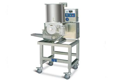 Автомат котлетный состоит из бункера, внутри которого есть лопасти, которые подают фарш в барабан. В барабане имеется отверстие определенной формы и поршень в точности повторяющий форму отверстия. Барабан вращается вокруг своей оси. В верхнем положении поршень опускается, а в образованную полость подается фарш, барабан прокручивается и поршень выдавливает сформованную котлету, которая дополнительно срезается струной. В итоге котлета падает на конвейер, расположенный под барабаном.