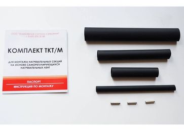 Комплект термоусаживаемых трубок ТКТ/М для муфтирования саморегулирующегося кабеляНастоящий комплект состоит из нескольких термоусаживаемых трубок на клеевой основе и медных гильз для соединения греющей части с питающей (двух жил и заземления). Применение клеевой основы позволяет добиться максимально плотного муфтирования, не допуская образования воздушных пузырей.Одного комплекта ТКТМ достаточно для произведения двух операций муфтирования – соединения греющей части секции с питающей и муфтирования концевой заделки.