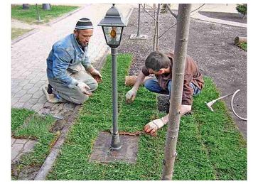 -Продаем оборудование системы автоматического полива.Укладывают газон по принципу кирпичной кладки, каждый следующий ряд кладут со смещением относительно предыдущего на 50%. По краю площадки следует укладывать целые куски газона. Не допускайте наложение полос газона друг на друга. Из досок делают пресс, которым аккуратно утрамбовывают каждый новый ряд газона. Помните, что нельзя ходить по незастеленным участкам. Если у вашей площадки дугообразные края, не пытайтесь согнуть пл