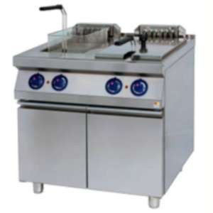 Газовая фритюрница, производства фирмы KOGAST (Словения) модель PF-Т7/28, предназначена для обжаривания разнообразных продуктов (картофель, мясо, рыба, овощи и фрукты вкляре) в разогретом до определенной температуры, растительном или животном масле (фритюре). Фритюрница имеет две ванны, вместимостью 14 л каждая, изготовленные из нержавеющей стали AISI 304. Ванны имеют отличную прочность и долговечность, а также, благодаря скругленным углам, их очень легко чистить. Также, аппарат рассчитан на использование двух корзин. Высокопроизводительные газовые нагревательные элементы расположены непосредственно внутри ванн, что способствует очень быстрому нагреву фритюра. Более того, горелки этой фритюрницы съемные, что еще больше упрощает очистку ванны. Мощность данной модели составляет 22,4 кВт. Наличие двух ванн позволяет готовить разные продукты одновременно без смешивания запахов. Непосредственно под самой фритюрницей есть закрытий шкаф с дверками и магнитным замком, где можно хранить подготовленные для жарки продукты. Корпус фритюрницы изготовлен из нержавеющей стали AISI 304 и соответствует всем стандартам и нормам гигиены профессионального кухонного оборудования. Несмотря на довольно компактные габариты (мм): 800 (ширина), 700 (глубина), 900 (высота) и вес - 99 кг, аппарат имеет хорошую производительность работы. Рабочая температура данной фритюрницы варьируется, в пределах от 100 до 190 °С. Прибор работает на природном или сжиженном газе. Расход газа не превышает 2,36 м3/ч – для природного и 1,76 кг/ч – для сжиженного. Аппарат оснащен механической панелью управления, на которой расположены: два поворотных тумблера (терморегуляторы) и два световых индикатора, для определения степени нагрева фритюра. Непосредственно под ванной фритюрницы расположен контейнер и кран для слива отработанного масла. Во избежание перегрева, в панель управления вмонтирован автоматический ограничитель температуры. Кроме того, модель оснащена специальным микровыключетелем, который не допустит на