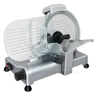 Корпус - литой алюминий, окрашенный в цвет слоновой кости. Защита ножа, лоток и подвижная перегородка из оксидированного алюминия. Вентилируемый двигатель. Закаленное профессиональное лезвие . Диаметр ножа 250мм, фиксированное устройство заточки ножа, максимальный размер нарезки продукта 230*185мм. Ход каретки 255мм.Длина нетто, мм : 480 Ширина нетто, мм : 363 Высота нетто, мм : 365 Мощность электрическая, кВт : 0.14 Напряжение, В : 220 Кол-во фаз : 1 Вес брутто,кг : 15 Диаметр ножа, мм : 250
