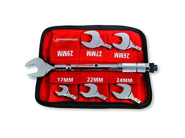 Динамометрический гаечный ключ Rothenberger позволяет устаналивать предельное усилие нажатия. В комплекте 6 головок SW: 17, 22, 24, 26, 27, 29 мм.